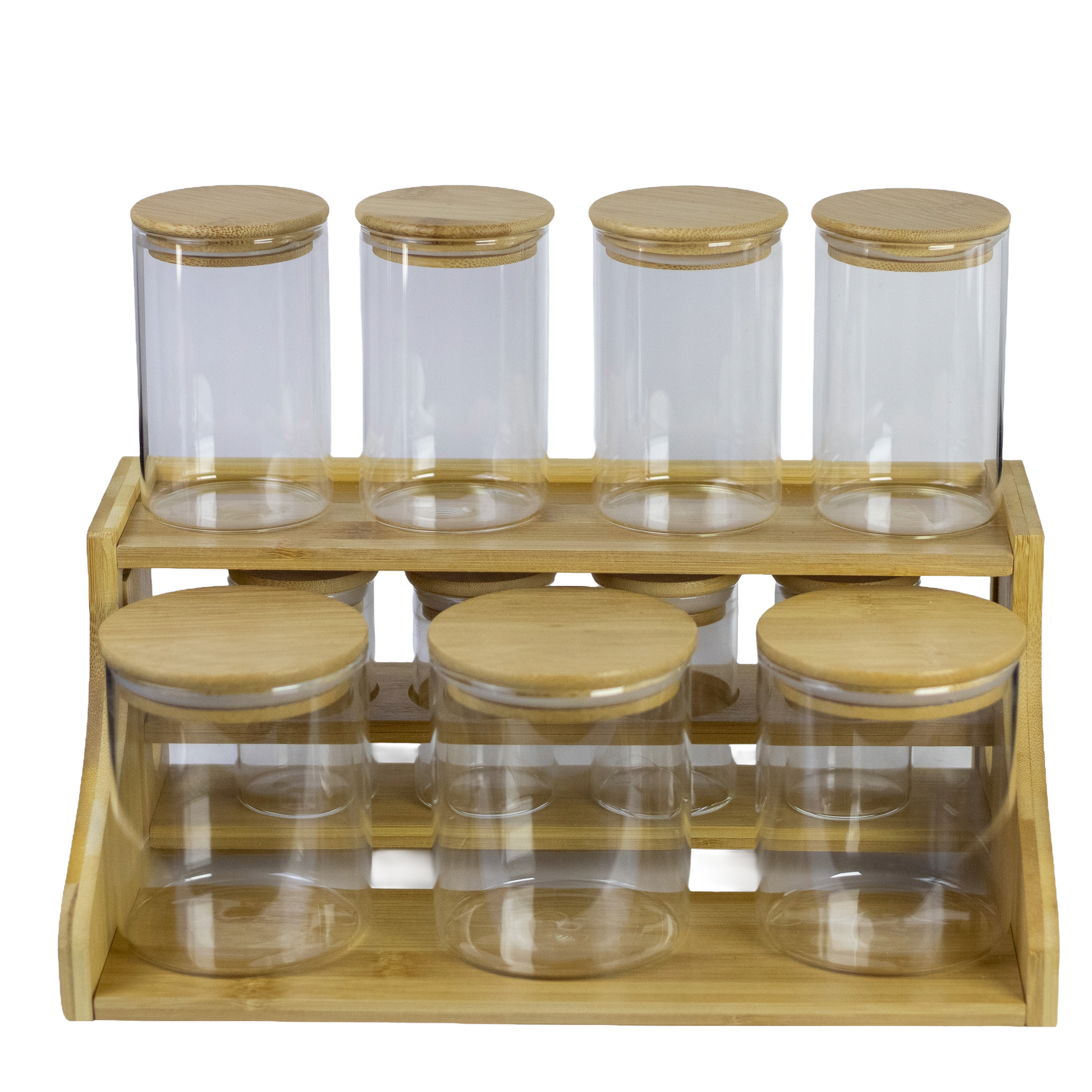 ✅ Complete Set – 11 glass jars plus 1 large bamboo stand and 1 mini stand that fits inside the large stand, perfect for spices, grains, and other dry ingredients